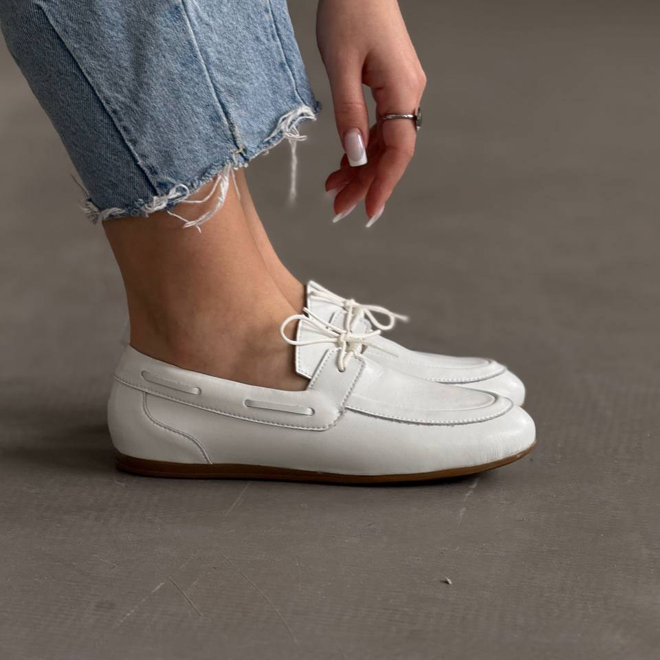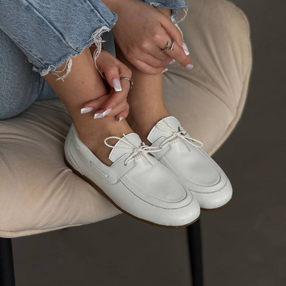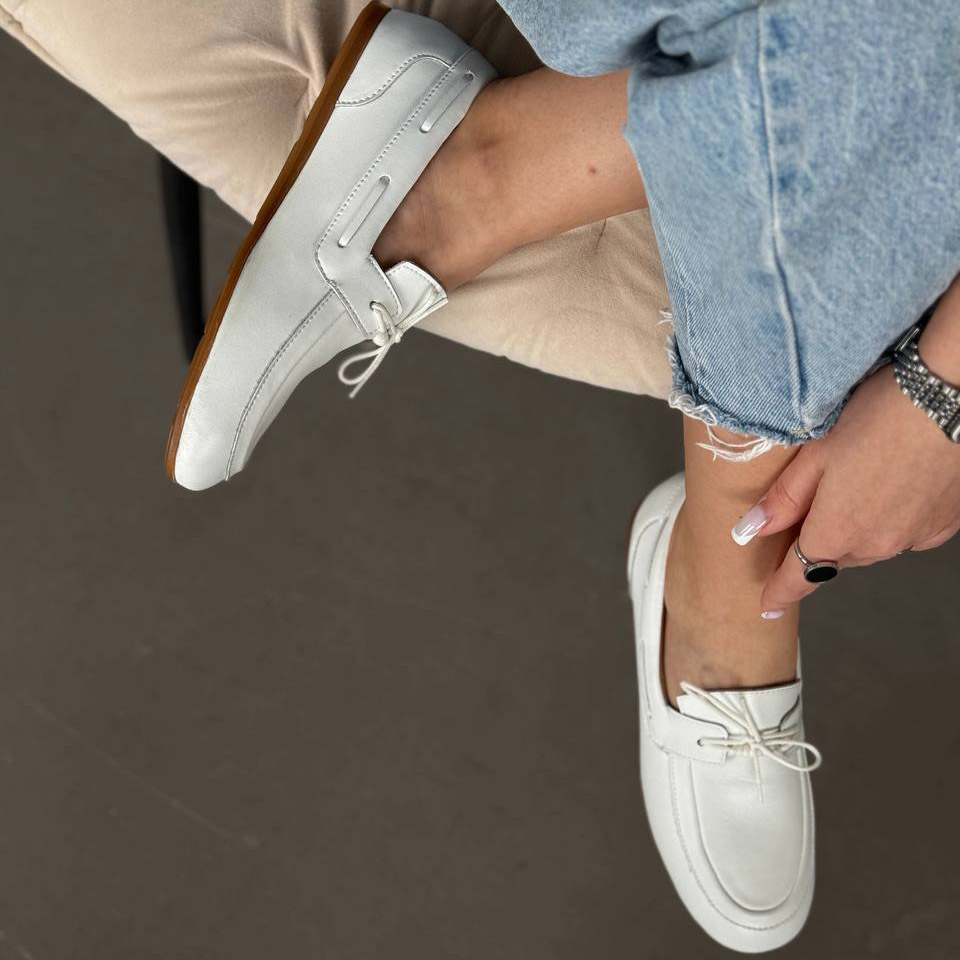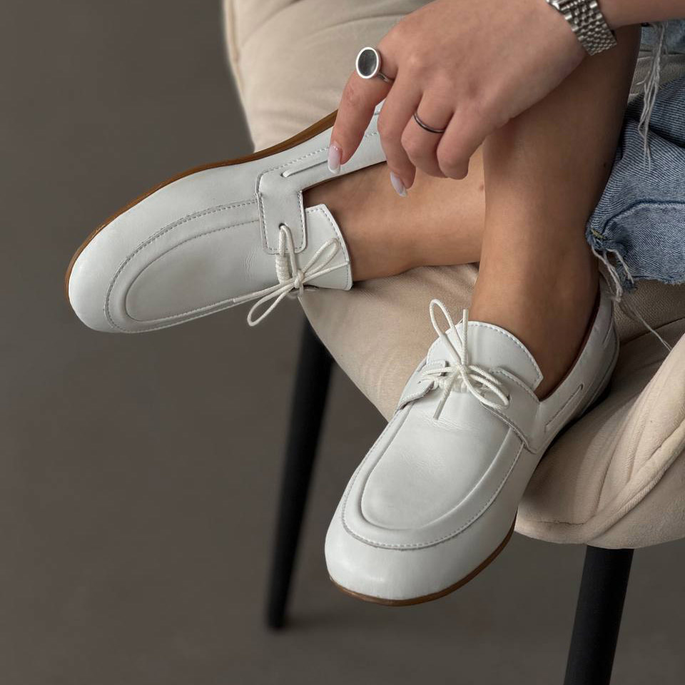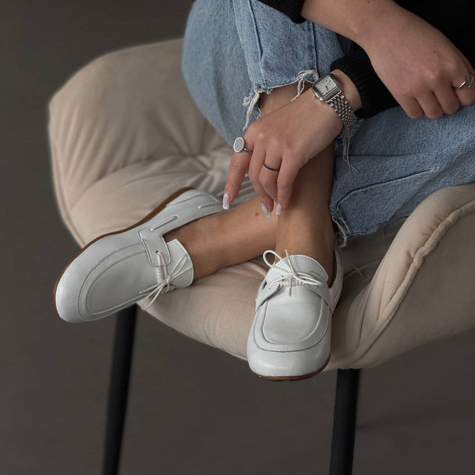 Акуратний силует, декоративна шнурівка та універсальний білий колір роблять ці лофери ідеальним вибором як для повсякденних образів, так і для більш стильних луків.