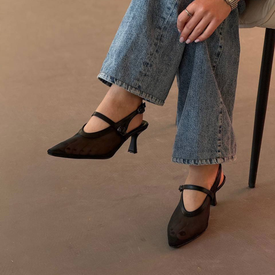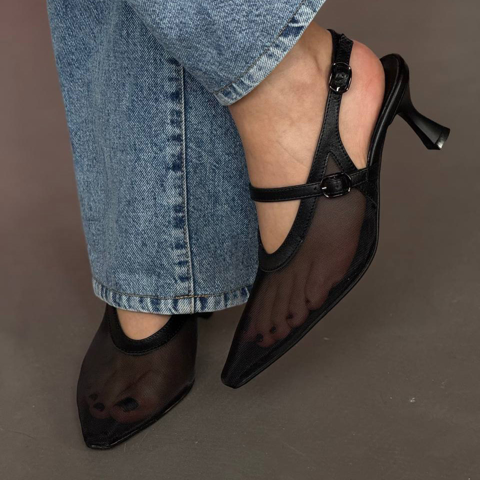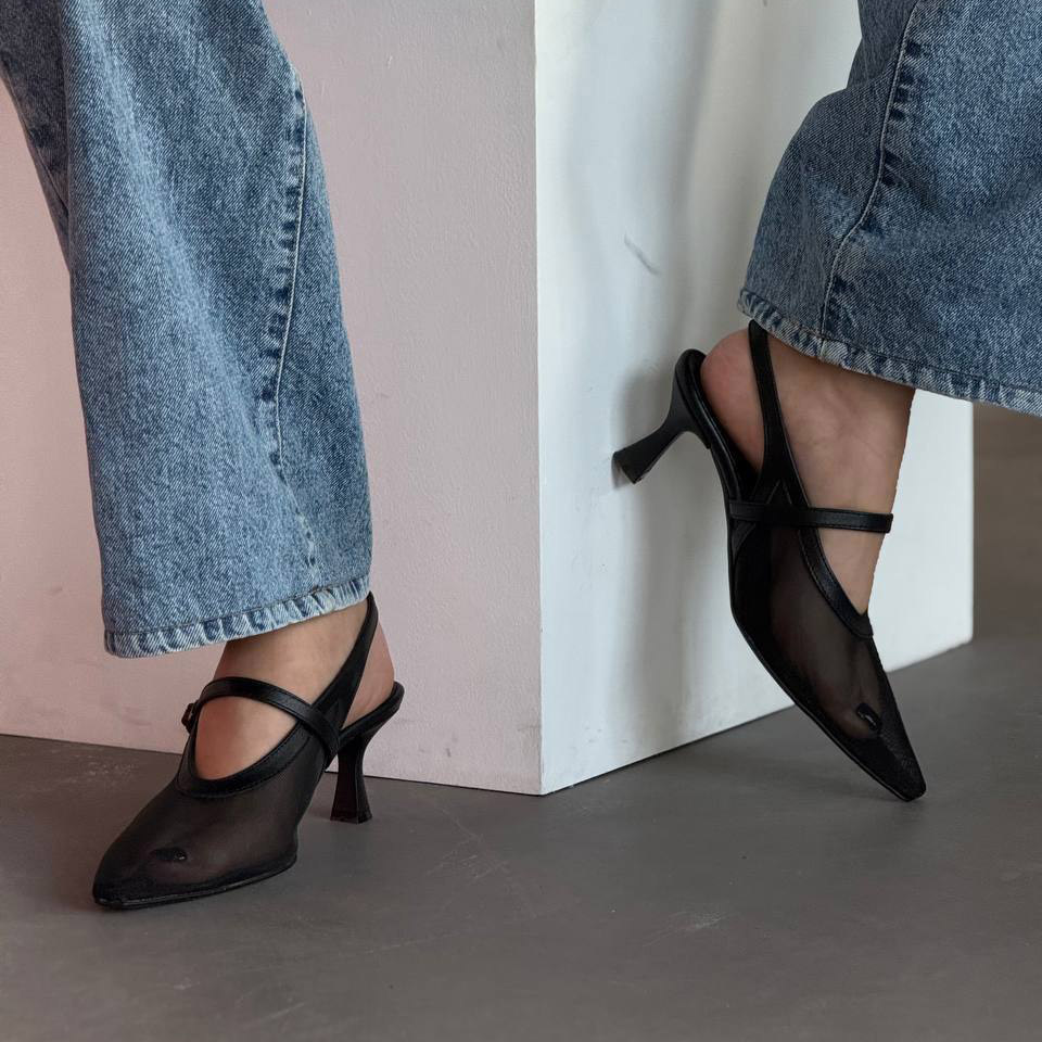 Чорні слінгбеки з натуральної шкіри — це поєднання класичного силуету та сучасних дизайнерських рішень. Напівпрозорі вставки додають легкості та роблять модель більш виразною, зберігаючи при цьому стриману естетику.