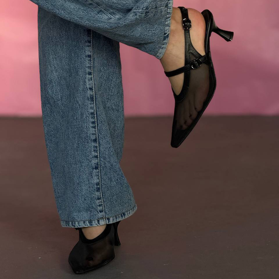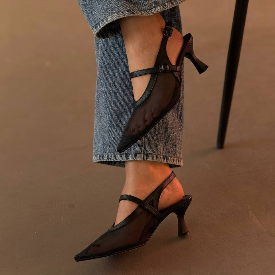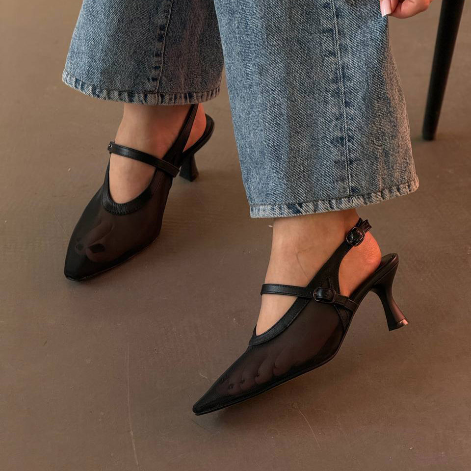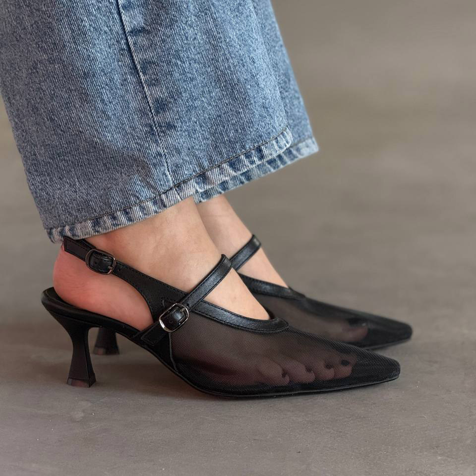 Чорні слінгбеки з натуральної шкіри — це поєднання класичного силуету та сучасних дизайнерських рішень. Напівпрозорі вставки додають легкості та роблять модель більш виразною, зберігаючи при цьому стриману естетику.