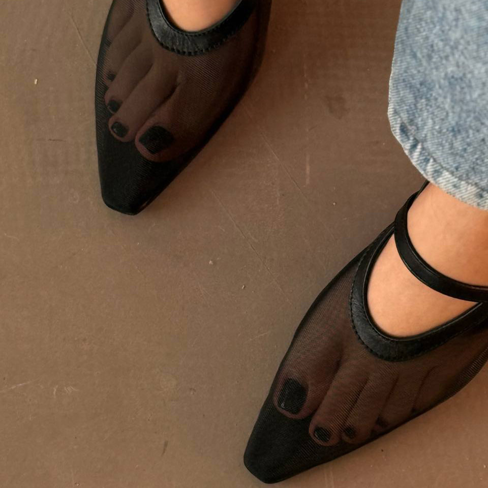 Верх виконаний з натуральної шкіри високої якості у поєднанні з делікатною сіткою, яка створює ефект легкості та підкреслює форму стопи. Ремінець через підйом забезпечує додаткову фіксацію та додає витонченого акценту.
