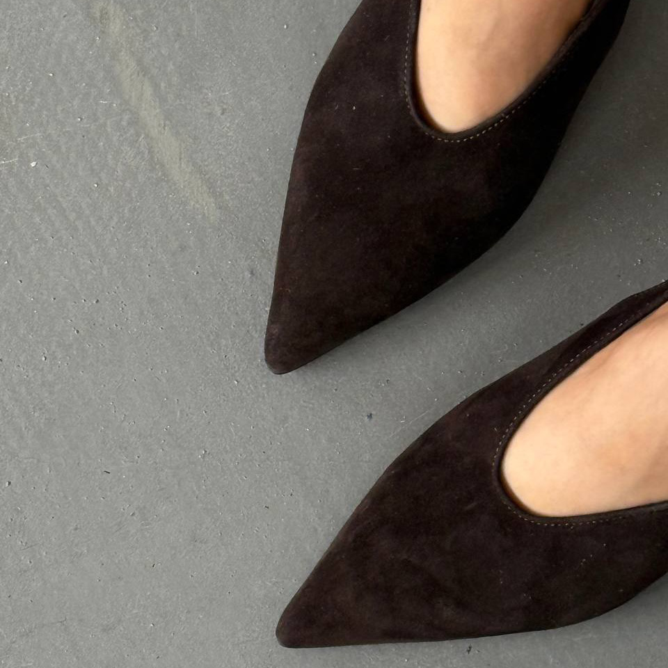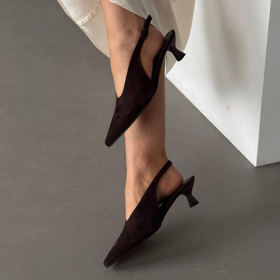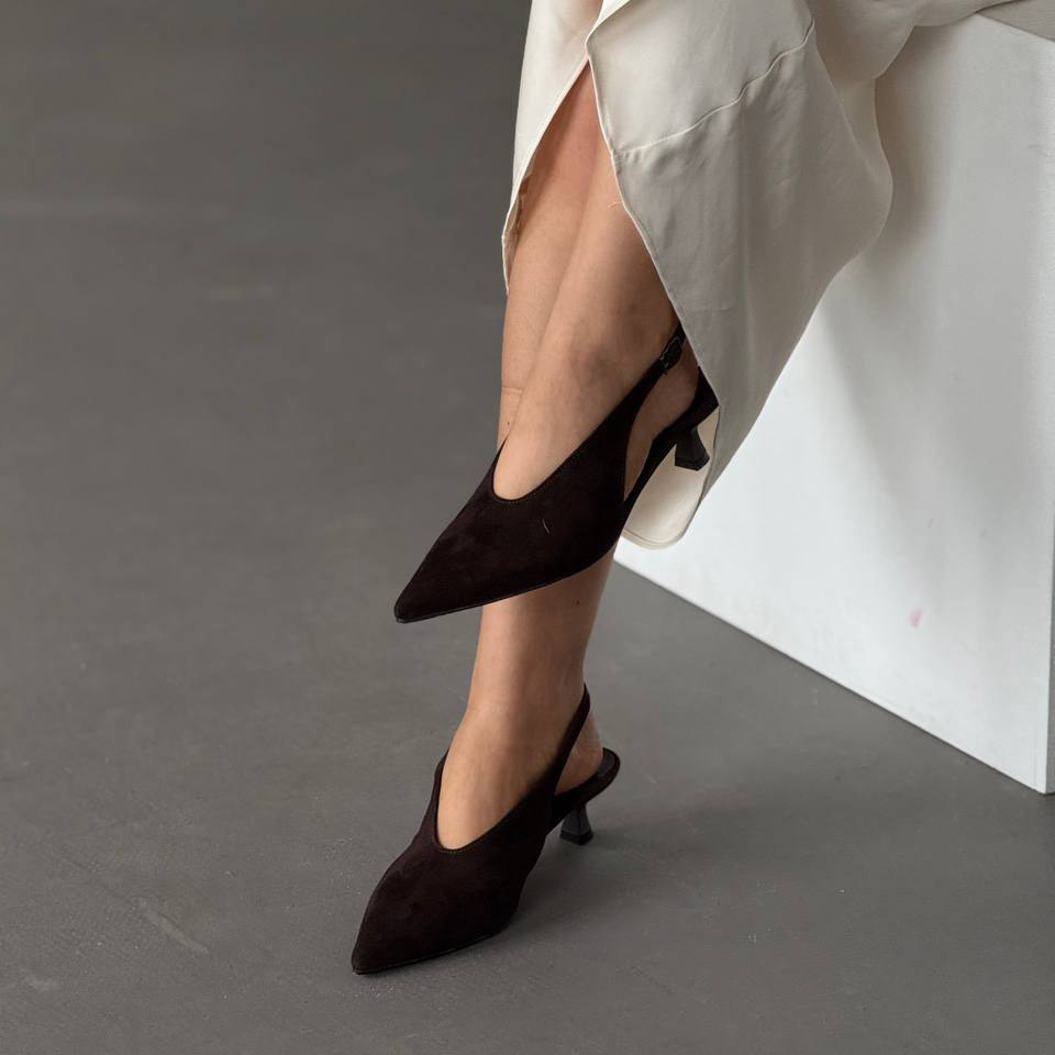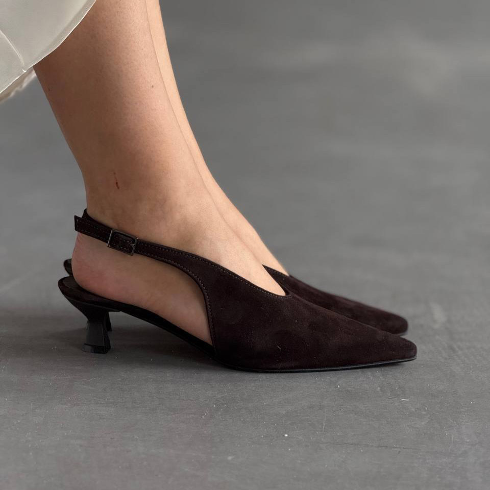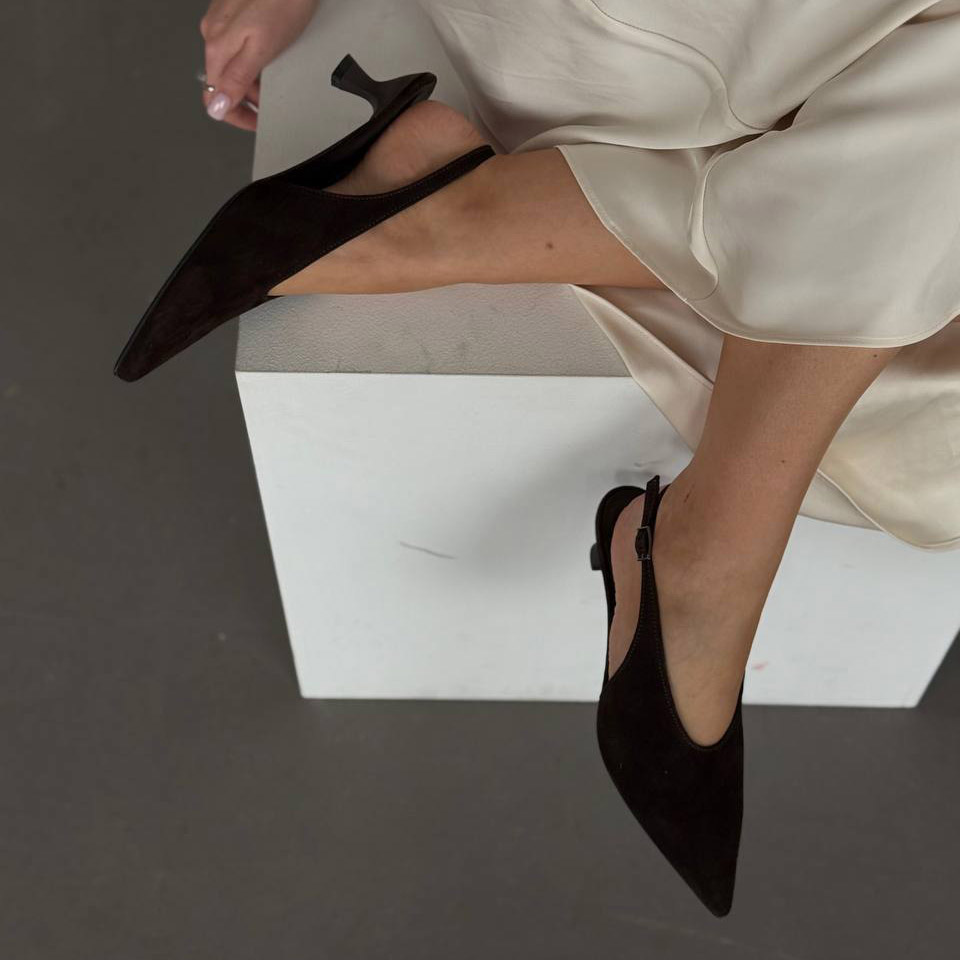 Елегантні коричневі замшеві слінгбеки з витонченим силуетом і зручним каблуком — універсальна база для стильних образів. Ідеально сідають по нозі та виглядають дорого в будь-якому поєднанні.