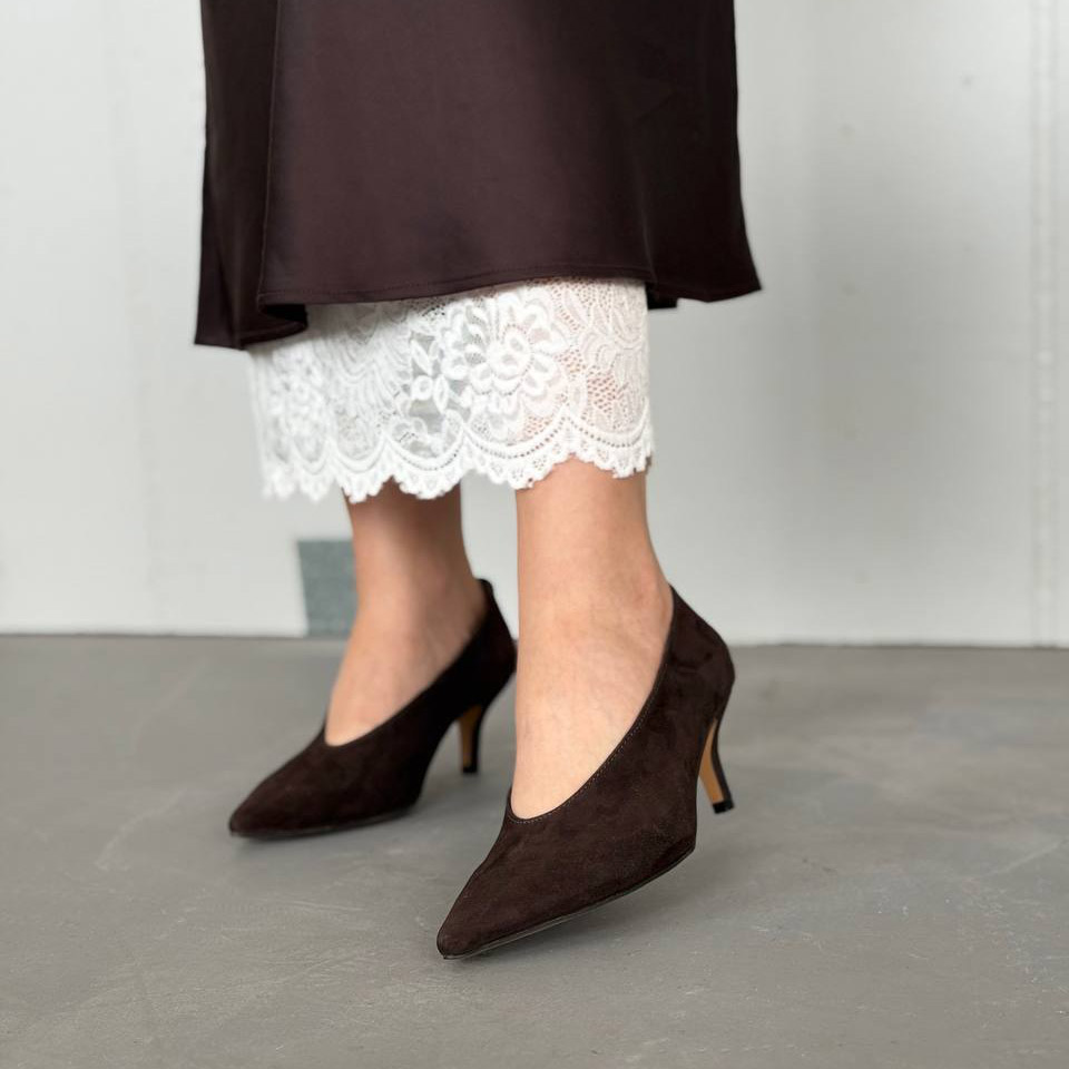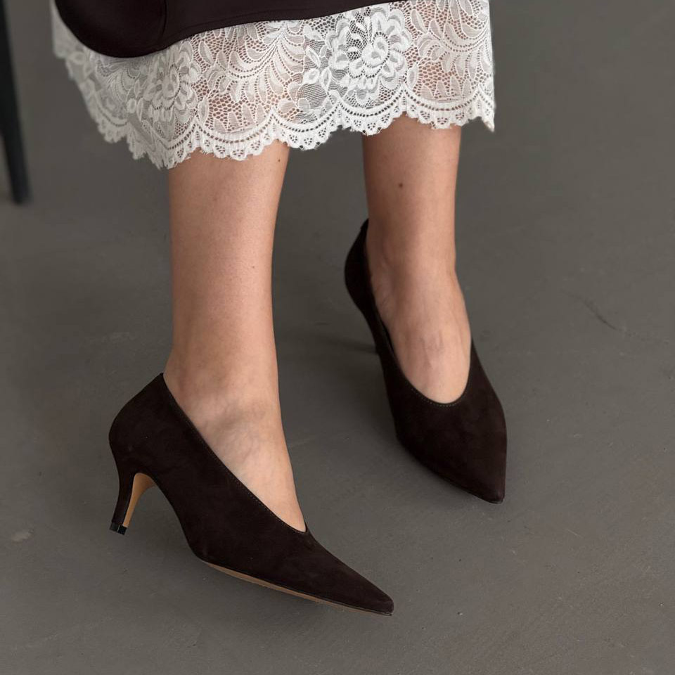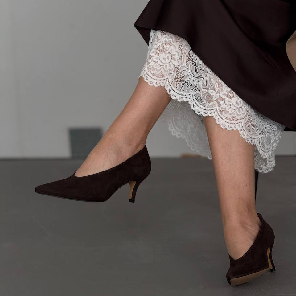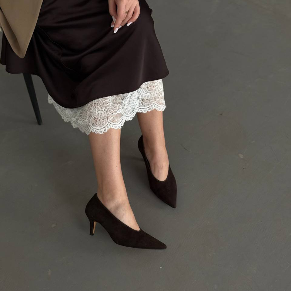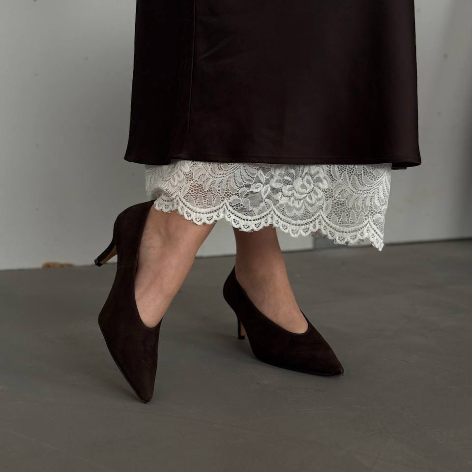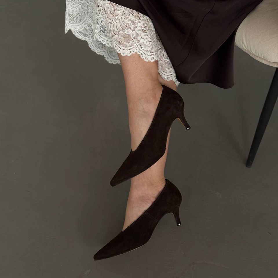 Коричневі замшеві туфлі-човники з витонченим силуетом і елегантним каблуком — класика, яка завжди виглядає дорого. Ідеально підходять для жіночних і стриманих образів.