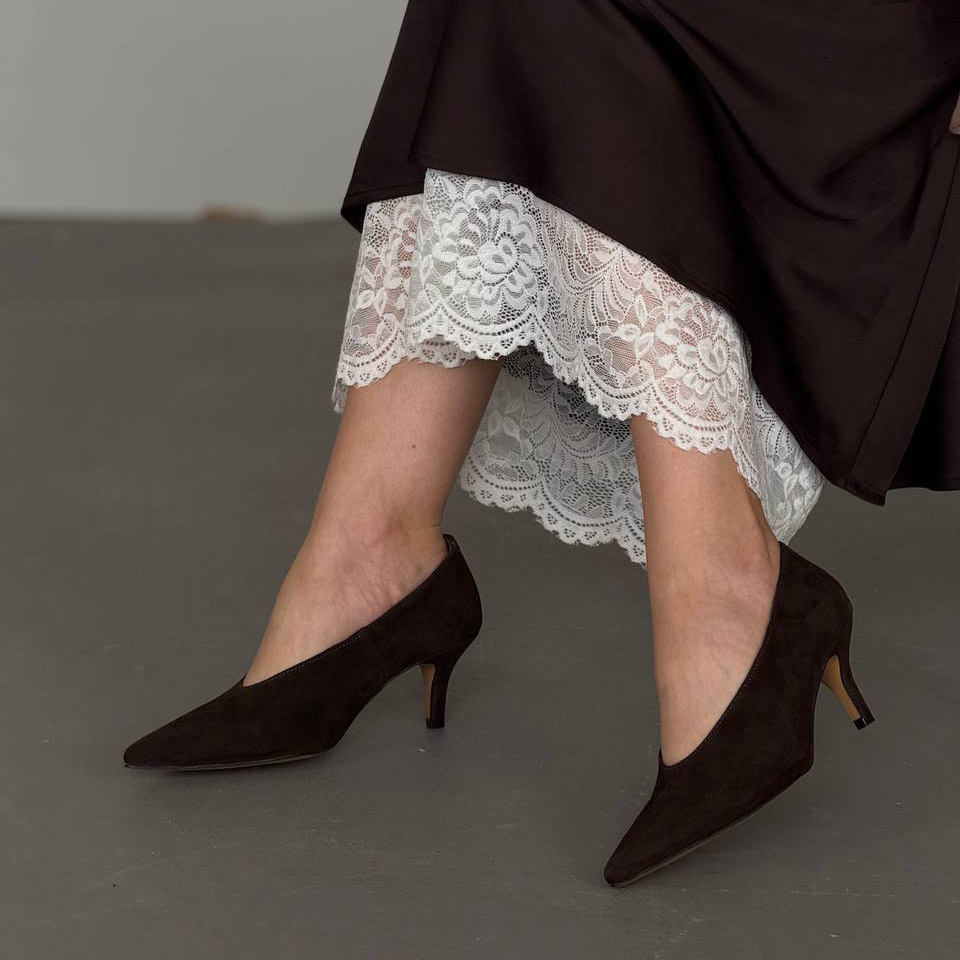 Загострений носок формує витончений силует і візуально подовжує ногу, а акуратний каблук середньої висоти додає елегантності без втрати зручності.